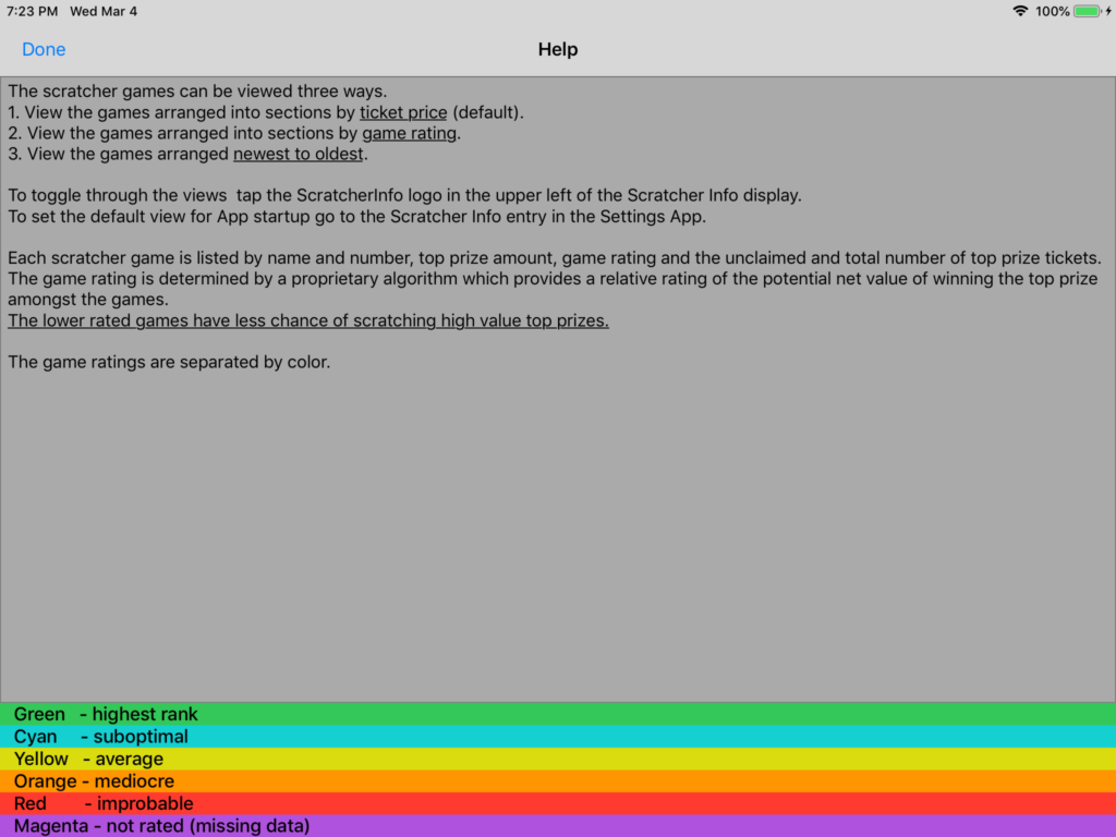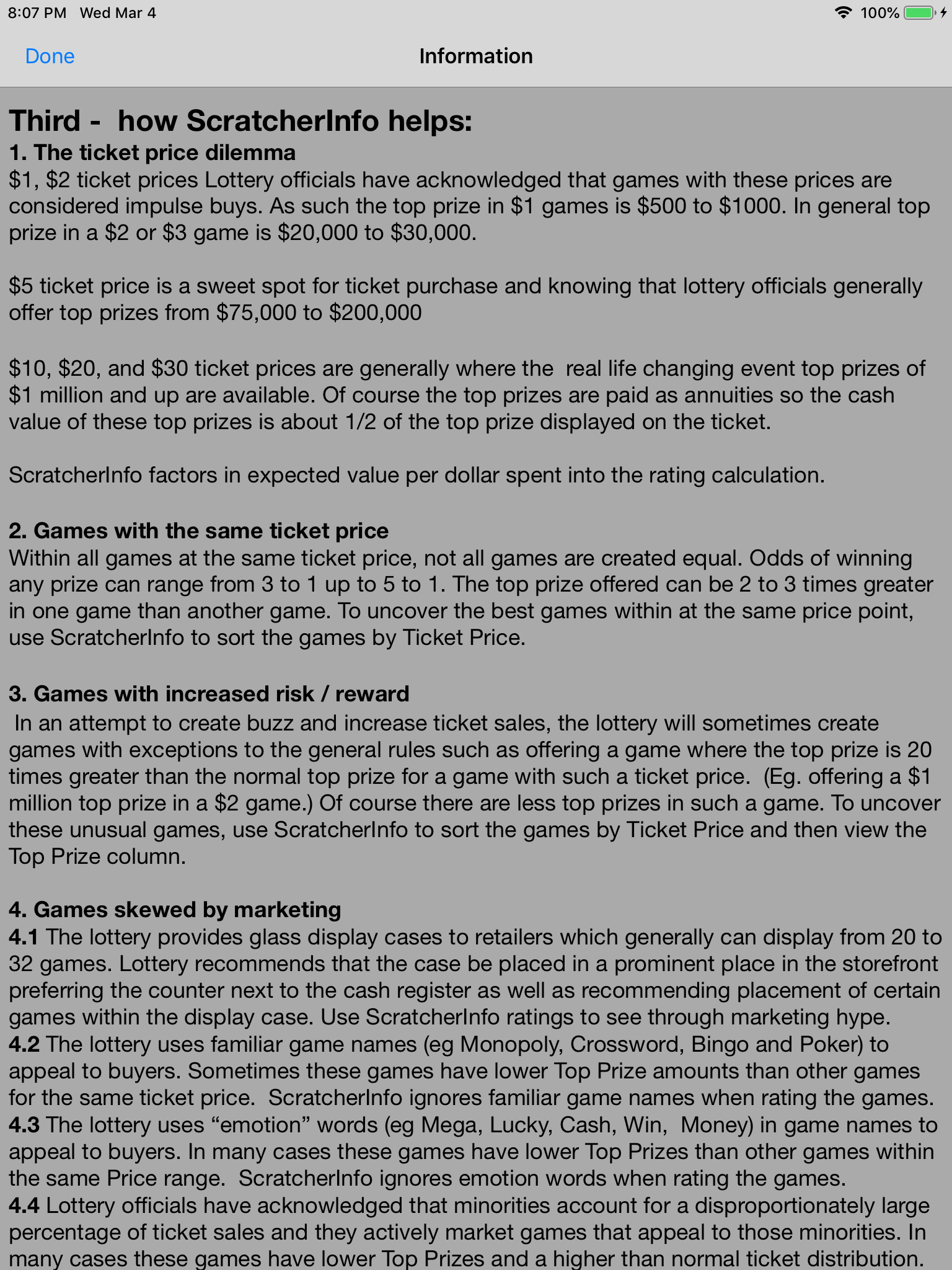 ScratcherRater is a utility app which provides a rated list of all lottery scratcher games for all current games within a state. (For a sample return to the Home page).